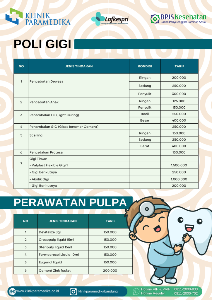 Dapatkan perawatan gigi berkualitas di Poli Gigi Klinik Paramedika. Kami menyediakan layanan mulai dari pembersihan karang gigi, penambalan, hingga pencabutan, semuanya dilakukan oleh dokter gigi profesional dan berpengalaman.
